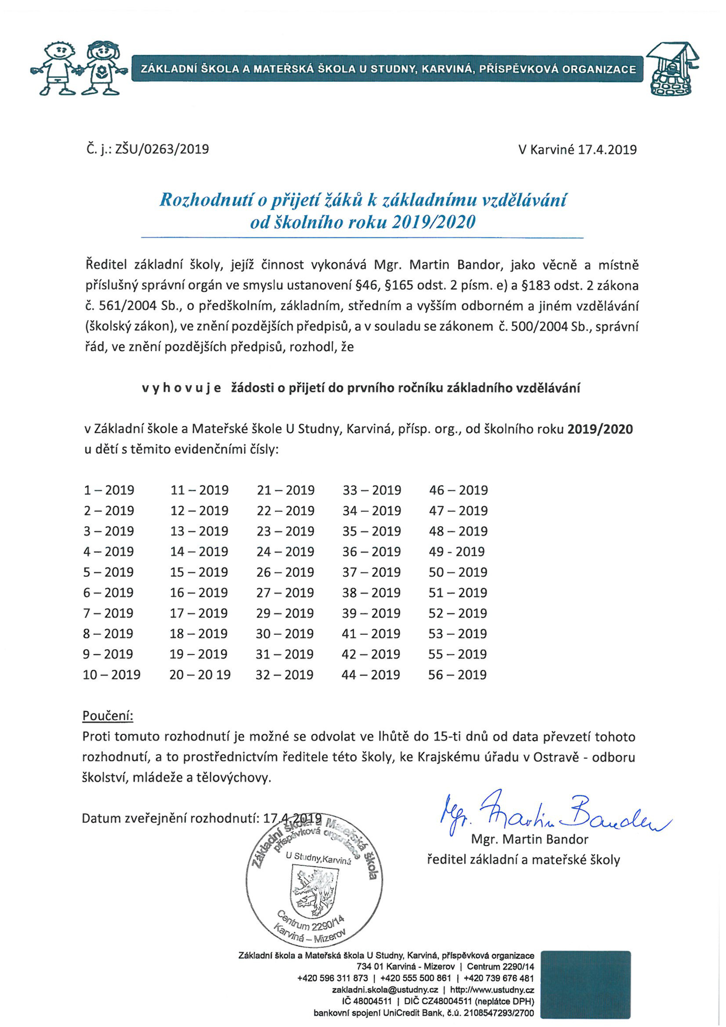 15.4.2019 - Rozhodnutí o přijetí žáků do prvních tříd