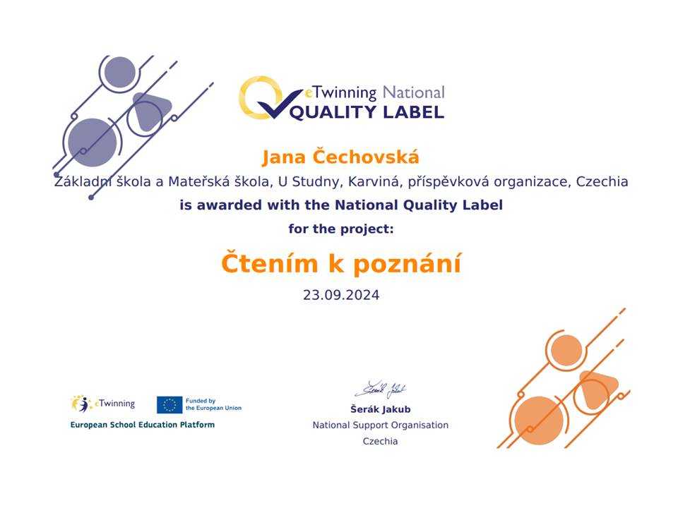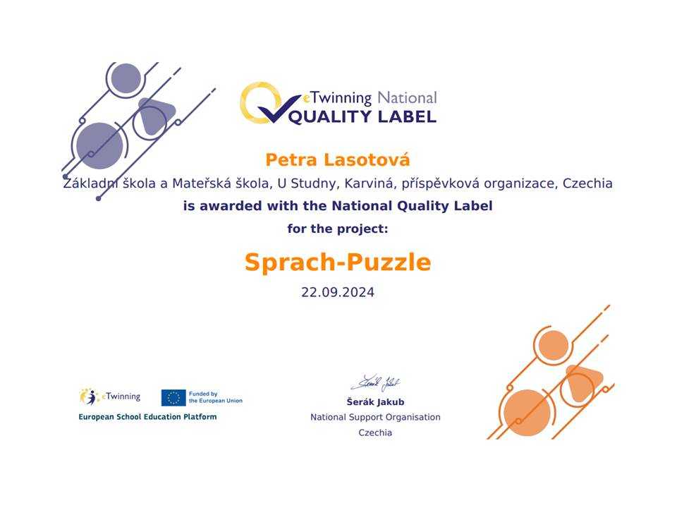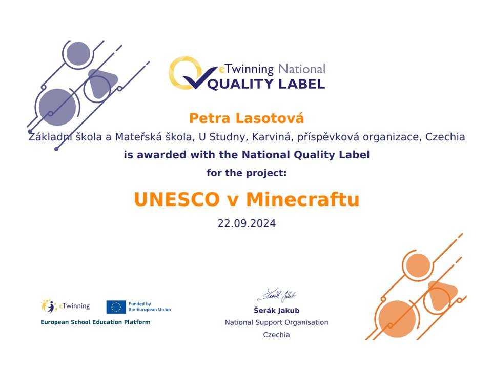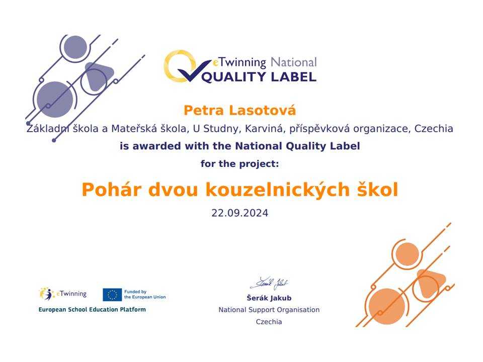 Naše škola sklízí další úspěchy v eTwinningových projektech za školní rok 2023/2024. Národní podpůrné středisko pro eTwinning udělilo v září 2024 národní certifikáty eTwinning Quality Label. Tyto certifikáty jsou udělovány učitelům realizujícím mezinárodní projekty, které splňují evropská kritéria kvality a v dané zemi mohou sloužit jako příklady dobré praxe v oblasti mezinárodní spolupráce škol online. Naše škola se stala hrdými držiteli hned 4 certifikátů za projekty realizované v zájmovém útvaru eTwinneři U Studny, ale také v běžné výuce na 1. i 2. stupni.