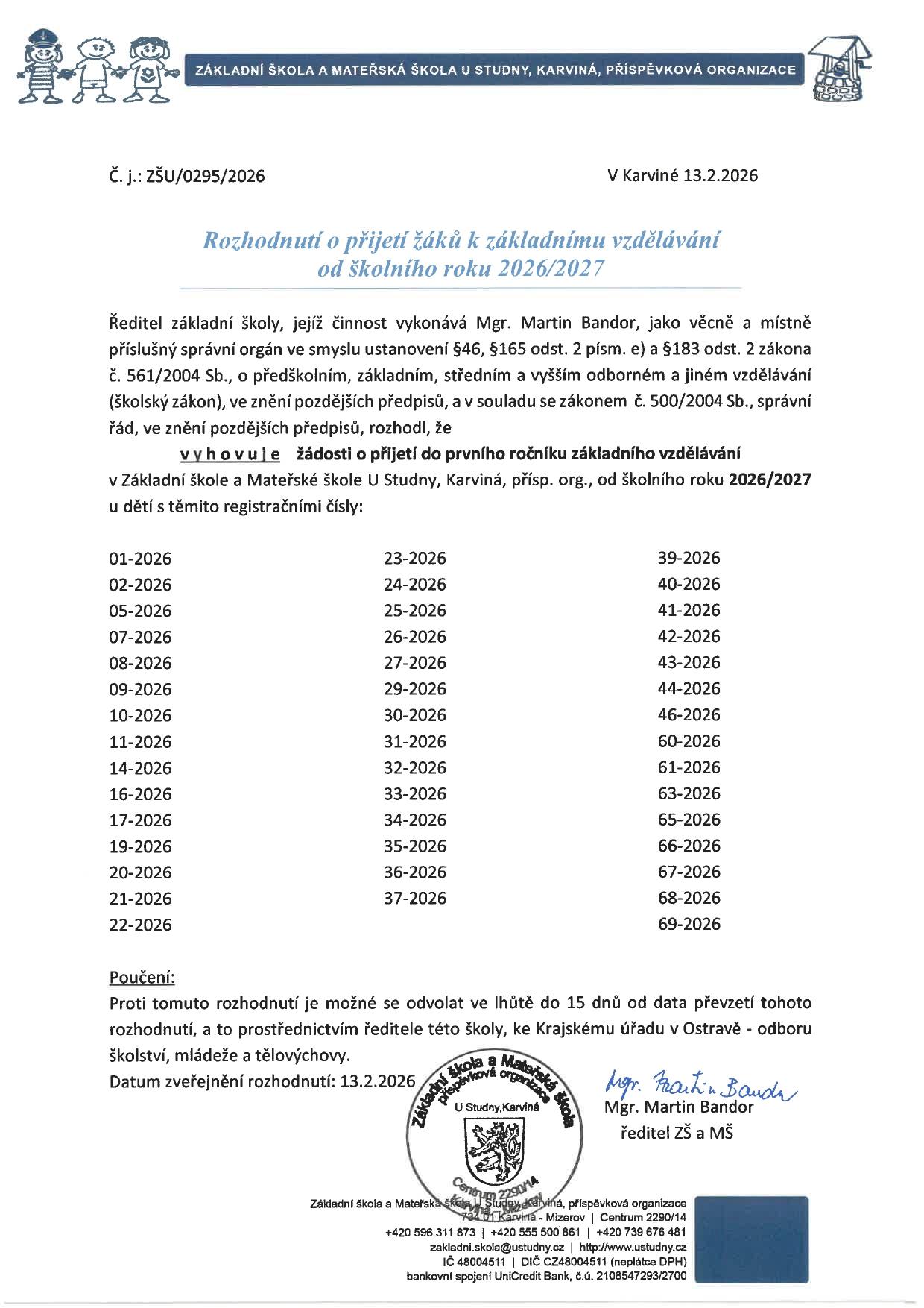 Ředitel školy vydal rozhodnutí o přijetí žáků k základnímu vzdělání pro školní rok 2026/2027.